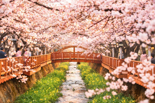 로망스 다리가 있는 여좌천, 철길 위로 벚꽃이 터널처럼 이어지는 경화역은 진해의 상징 같은 장소입니다. 사실 진해는 어디를 걸어도 벚꽃이 이어집니다. 도시 전체가 봄으로 물드는 경험, 이곳에서 가능합니다.