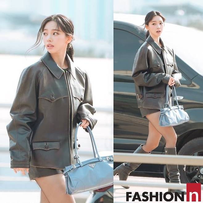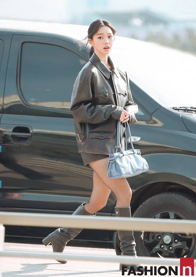 그룹 에스파(Aespa) 카리나가 걸크러시 가죽 쇼츠룩으로 공항 잇걸로 스포트라이트를 받았다.