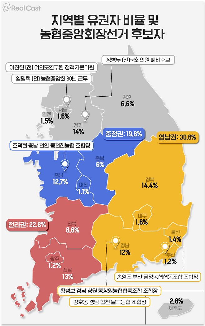 다수의 후보가 출사표를 낸 영남지역 인물이라는 점도 복병입니다. 30.6%에 달하는 영남권 표심이 지역 출신 후보에 분산될 것으로 보이기 때문입니다. 지난 22일 사퇴한 최성환 후보 외에도 영남권에서는 총 3명의 조합장이 경합 중으로 이들 모두 유력 후보로 거론되고 있습니다.