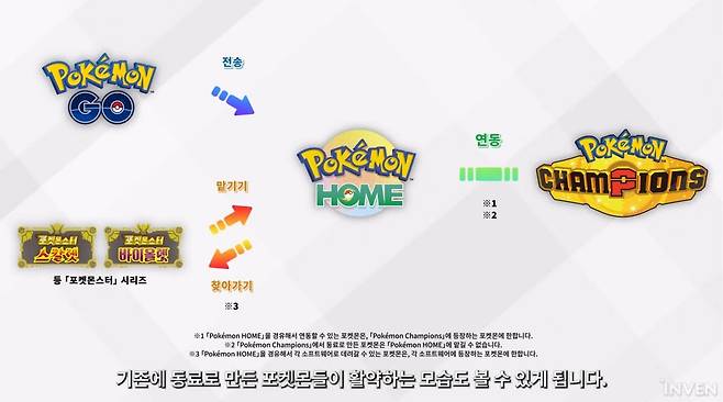한편, 포켓몬 클라우드 서비스 '포켓몬 홈'과의 연계도 예고됐다. 이를 통해 '포켓몬 챔피언스'에서 얻은 포켓몬 외에도 포켓몬 GO, 포켓몬 스칼렛/바이올렛에 등장한 포켓몬 일부를 사용할 수 있다.