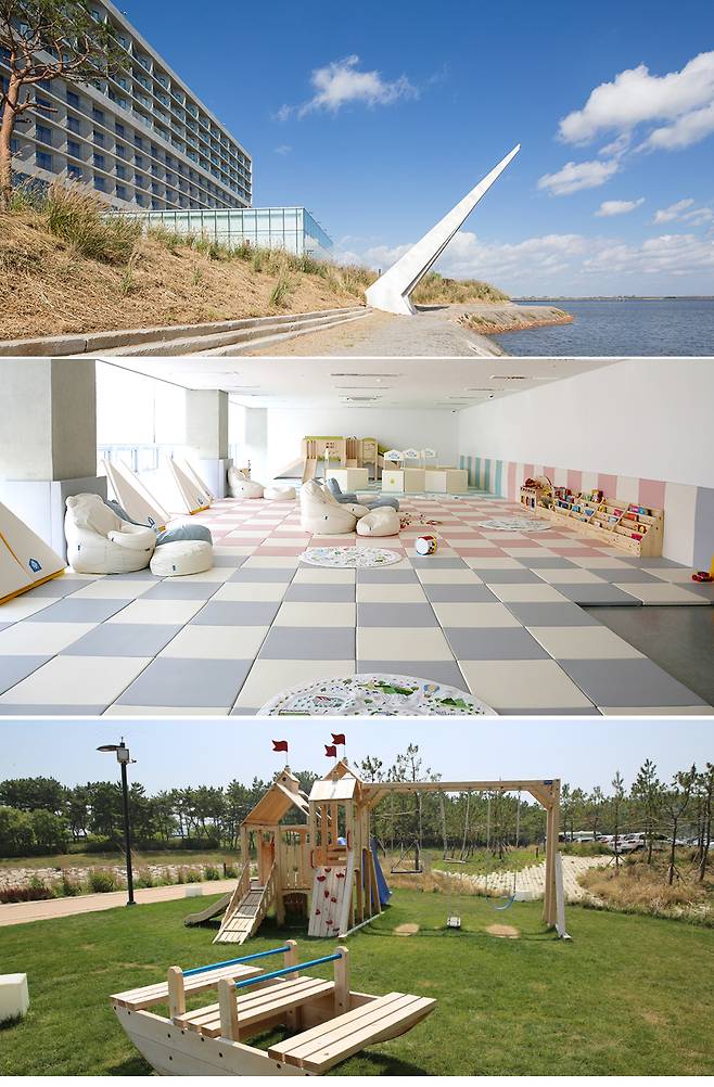 야외에는 아웃도어 키즈존과 프라이빗 해변이 있으며 모래놀이 장난감도 로비 내 컨시어지에서 대여 가능하다.