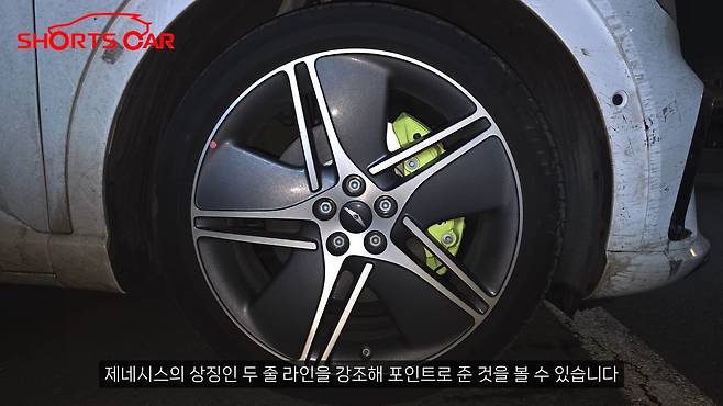또한 파이브 스포크 형태에 제네시스의 상징인 두 줄 라인을 강조한 것이 특징이다. 브레이크 캘리퍼는 형광색으로 도색되어 있지만, 기아 GT 모델의 상징적인 컬러라는 점에서 제네시스만의 컬러를 적용했으면 어땠을까 하는 아쉬움이 남는다.