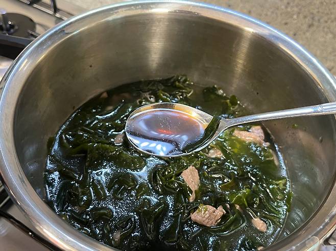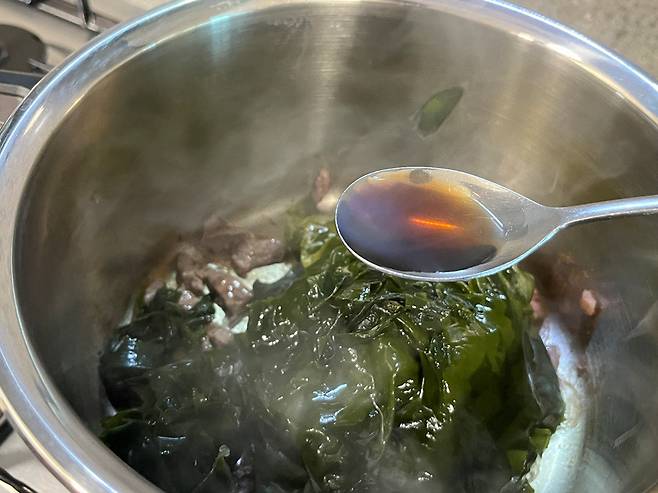 국간장 2~3 스푼을 추가하여 국물 맛을 냅니다. 저는 미역국 끓일 때 국간장으로만 간 하는 것을 추천해요. 그래야 텁텁함 없이 깔끔한 맛을 느낄 수 있습니다.