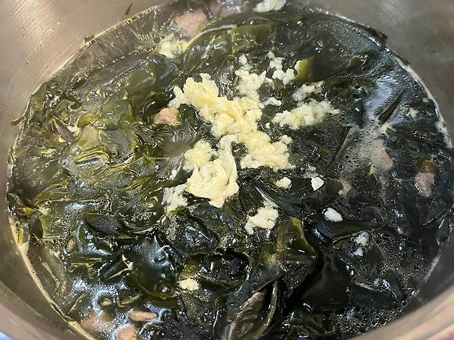 한소끔 끓어오르면 중약불로 줄인 뒤 다진 마늘 4쪽을 넣어줍니다. 마늘은 너무 일찍 넣으면 향이 다 날아갈 수 있으므로, 국물이 어느 정도 우러났을 때 넣어 알싸한 풍미를 더해주는 것이 좋습니다. 마늘의 향이 은은하게 배어들면서 국물의 풍미를 한층 끌어올려 줍니다.
