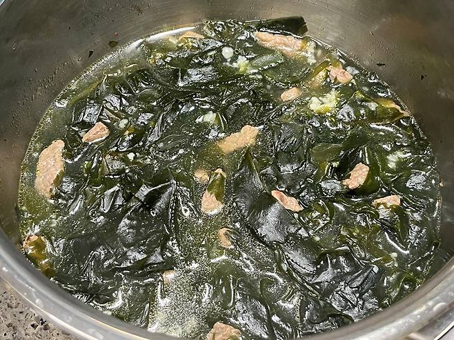 국간장으로 간을 맞춘 뒤에는 불을 약하게 줄이고 5~10분 뭉근하게 끓여주세요. 고기 양지의 깊은 육수와 미역 본연의 시원한 맛이 국물 속에 완전히 녹아들면 완성입니다. 이렇게만 끓이면 최소한의 재료로도 충분히 진하고 깔끔한 맛의 미역국을 만들 수 있습니다.
