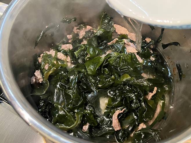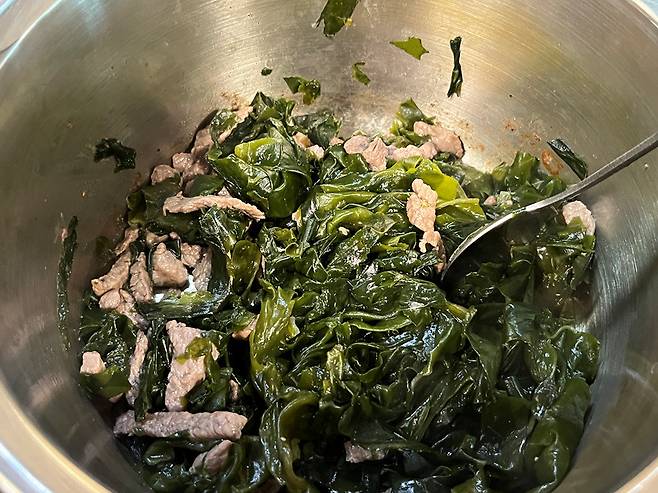 고기가 어느 정도 익으면 준비해둔 미역을 넣고 함께 볶아줍니다. 참기름을 넣지 않는 대신 고기에서 배어 나오는 소량의 지방과 미역 자체의 수분만으로 충분히 볶아주는 것이 핵심입니다.
