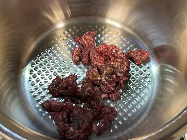 팬에 소고기 양지 150g은 키친타월로 핏물을 꼼꼼하게 닦아내세요. 냄비에 준비한 양지를 먼저 넣고 고기 겉면이 하얗게 익을 때까지 가볍게 볶아주세요. 고기가 너무 들러붙으면 식용유 아주 살짝 추가해 볶습니다.