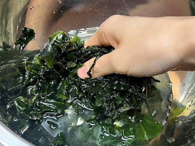 먼저 마른 미역을 찬물에 10~15분 충분히 불려준 뒤, 거품이 나오지 않을 때까지 여러 번 주무르며 깨끗이 헹궈줍니다. 잘 불린 미역은 물기를 꽉 짠 후 먹기 좋은 크기로 썰어 준비해 주세요. 이때 미역의 물기를 제대로 제거해야 나중에 비린내나 잡내가 배어 나오지 않아요.