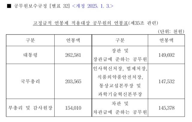 공무원 연봉은 매년 공무원 보수규정에 따라 정해지는데, 대통령과 국무총리, 장관 등 '고정급적 연봉제' 공무원은 매년 공무원 보수 인상률에 따라 일률적으로 연봉이 결정된다.