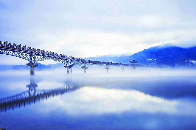 해가 떠오르기 전, 안동호 위에 피어오른 물안개는 다리와 주변 경치를 감싸며 신비로운 분위기를 자아냅니다.