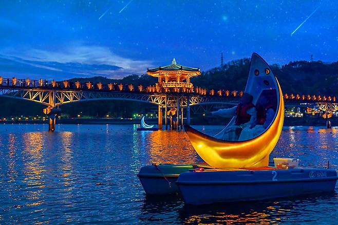 보트를 타고 물 위에서 바라보는 조명이 켜진 월영교는 마치 영화 속 한 장면처럼 환상적인 느낌을 줍니다.