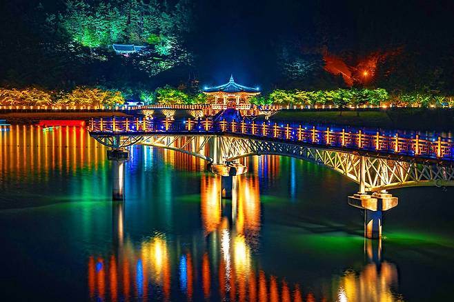 한국에서 가장 긴 나무다리로 유명한 월영교는 안동호를 가로지르며 사계절 내내 다채로운 풍경을 선사합니다.