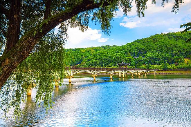 햇빛이 비치는 낮의 월영교는 주변 산과 하늘이 물 위에 비춰 더욱 아름답습니다.
