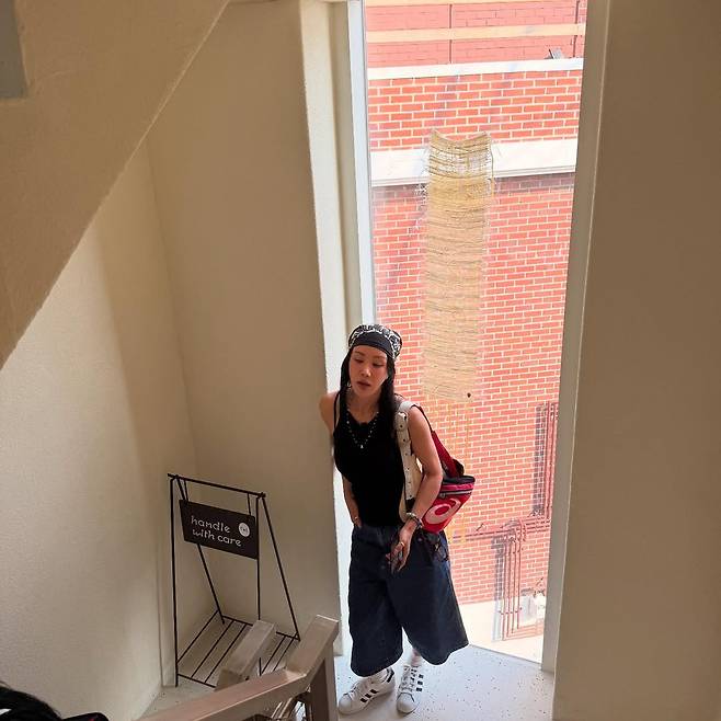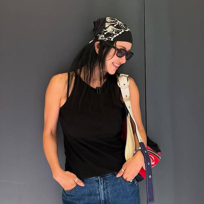 공개된 사진 속 엄정화는 블랙 민소매 톱에 5부 데님 팬츠, 그리고 머리를 감싸는 독특한 패턴의 스카프를 매치해 편안하면서도 트렌디한 여름 스타일을 완성했다.