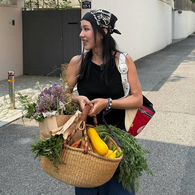 그녀는 커다란 라탄 바구니에 신선한 채소와 꽃을 가득 담은 채 환하게 웃고 있는 모습으로, 도심 속 여유를 즐기는 한 장면 같은 분위기를 연출했다.