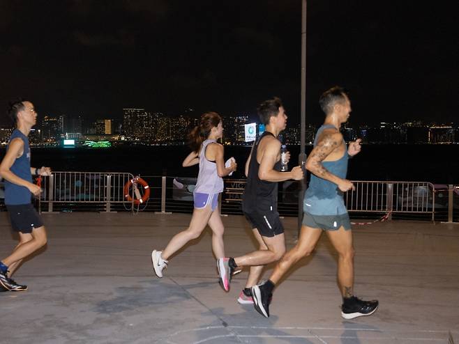 수요일 밤, 해피 밸리에 들어서자 경마 트랙 위에서 홍콩 사람들이 여가 시간을 즐기며 하루를 마무리하고 있다. 레이스가 없는 날이면 이곳은 드넓은 운동장이 된다. 너른 잔디밭을 나눠 골대를 세우고 공을 차는 사람들이 가장 많이 보인다. 러닝 크루 하버 러너스도 몸의 열을 올리고 근육을 늘리며 달릴 준비에 한창이다. 하버 러너스는 홍콩 시내를 달리며 활기찬 홍콩을 탐험하고 러닝의 즐거움을 알리고 싶은 사람들로 구성된 커뮤니티다. 2010년부터 몇몇 디자이너와 크리에이터가 스트레스 해소를 목적으로 달리기 시작해 지금은 다양한 분야의 종사자들로 구성된 커뮤니티 기반의 달리기 모임으로 발전했다.