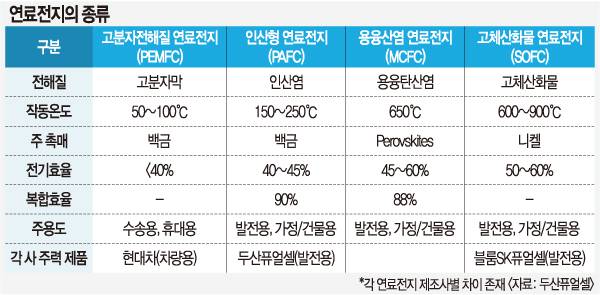 수소연료전지 개발에 뛰어든 기업은 두산, SK, 포스코 등이다. 두산그룹은 2014년 미국 클리어엣지파워를 인수해 두산퓨얼셀을 출범시켰다. 두산퓨얼셀은 현재 연간 440㎾용 168대, 총 90㎿ 규모의 한국 최대 연료전지 생산기지를 확보하고 있다. 연내 가동라인을 늘려 275㎿ 규모의 연료전지를 생산할 계획이다.