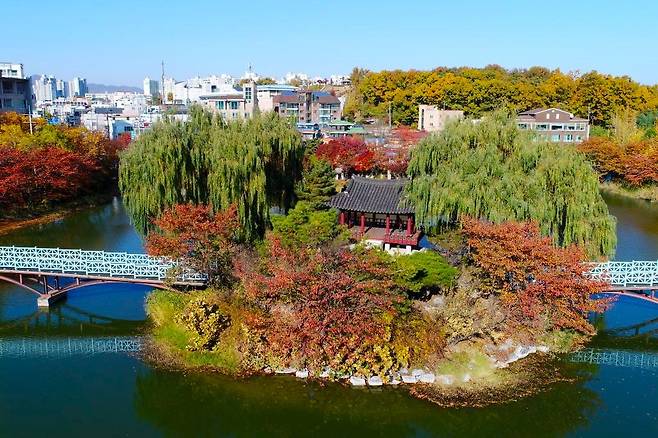 애련정(愛蓮亭)은 이천시 안흥동 이천온천의 주변 연못 안흥지에 있는 아담한 정자인데요. 임원준의 ‘애련정기’에 의하면 이천부사 이세보가 동헌 동쪽 편에 세운 것이라고 전해지죠. 이세보는 당시 영의정이었던 신숙주에게 부탁해 애련정이라는 이름을 지었다고 합니다.
