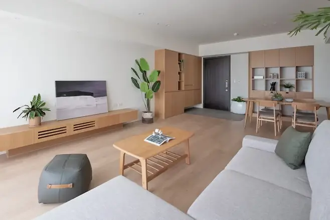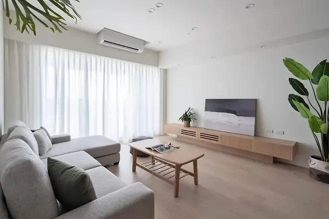 빛의 흐름을 거스르지 않는 채광 설계가 돋보이는 거실은, 불필요한 수납장을 제거하는 '감산의 미학'으로 넓고 여유로운 분위기를 완성했다.