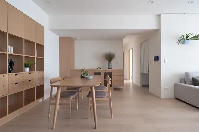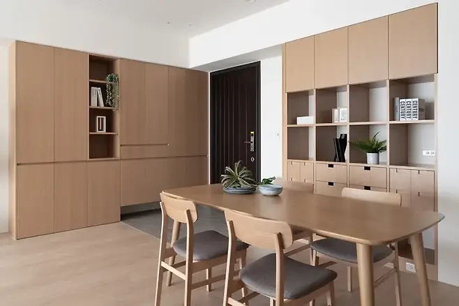 은은한 오크 톤이 주가 되는 다이닝 공간은 부엌과의 경계를 허물어 하나의 큰 공용 공간처럼 구성된다. 가전 수납과 식사 공간이 결합된 다이닝룸에서는 간단한 요리도 효율적으로 이뤄지며, 가족 간 대화도 자연스럽게 이어진다.