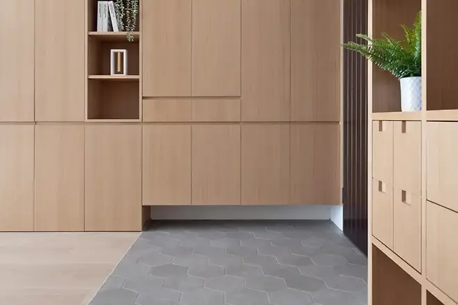 회색 육각 타일로 경계를 나눈 현관은 실내로 이어지는 진입 동선을 부드럽게 받아낸다. 높낮이 차이를 없앤 바닥 마감은 휠체어나 유모차 이용에도 불편함이 없도록 배려했다.