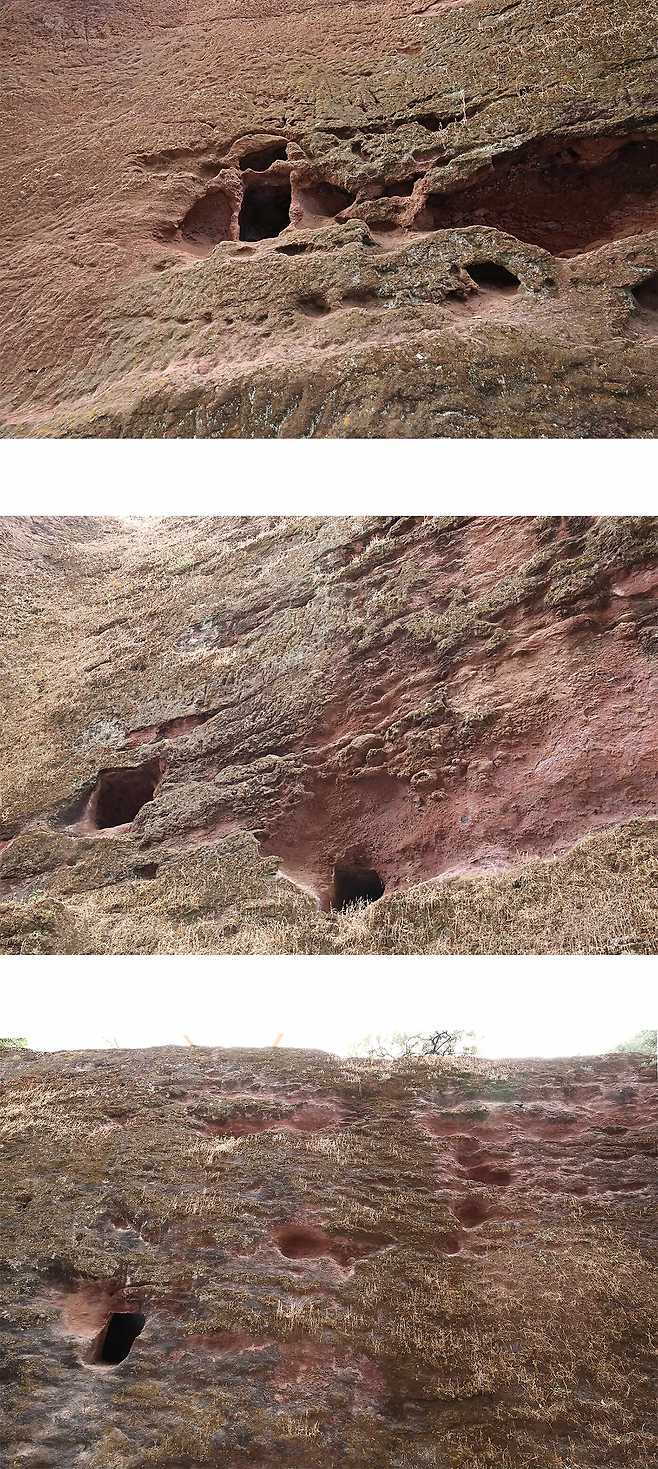 교회를 파 내려간 바깥 벽에는 크고 작은 동굴이 있다.