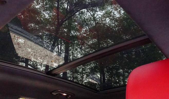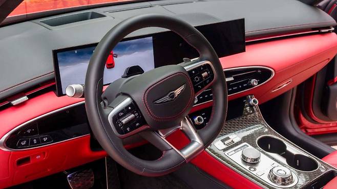GV70의 실내에 있는 27.0인치 화면은 크지만 과하지 않으며, 스타일링에 잘 녹아듭니다. 필요한 정보를 노트북 화면처럼 선명하게 보여줍니다. 빨간색 실내 장식은 빨간색 스티치와 함께 검은색과 조화를 이루며, 가죽 퀼팅이 적용되어 고급스러움을 더합니다. 파노라마 글라스 루프는 차량을 실제보다 더 크게 느끼게 해줍니다.