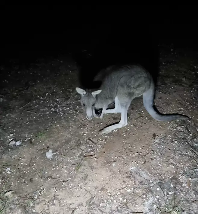 구조대원들은 어미 캥거루의 진정제가 사라질 때까지 기다렸습니다. 자정이 지나서야 어미 캥거루가 깨어나기 시작했습니다. 녀석은 천천히 균형을 잡고 아기를 발견하고 덤불 속으로 뛰어내렸습니다. 분명 위험에서 벗어난 것에 감사했을 것입니다.