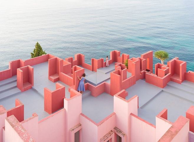 라 무라야 로하는 스페인 칼페에 자리한, 마치 동화 속에나 나올 법한 특별한 건축물입니다. 건축가 리카르도 보필(Ricardo Bofill)이 1968년에 설계해 1973년에 완공된 이 아파트는 그 구조와 색감에서부터 일반적인 아파트와는 차원이 다른 느낌을 자아냅니다. 파란 하늘 아래 선명하게 드러나는 빨강, 파랑, 분홍 등의 다채로운 색조와, 끝없이 이어지는 미로 같은 계단이 몽환적이면서도 초현실적인 분위기를 만들어내죠. 이곳은 오랫동안 인스타그램을 사랑하는 여행자들 사이에서 ‘인스타그램 핫플’로도 유명했습니다.