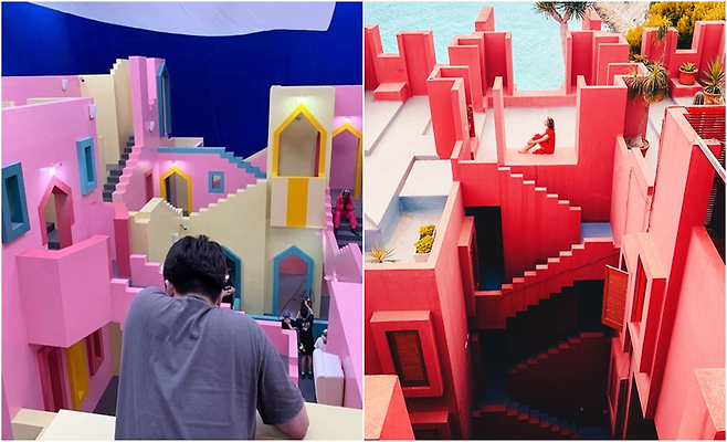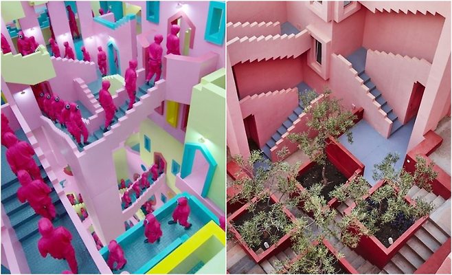 리카르도 보필은 아랍 지중해 건축 양식과 이슬람 도시의 성채인 ‘카스바’를 전위적으로 재해석해 라 무라야 로하를 설계했습니다. 건물 내외부를 관통하는 계단과 연결된 다리, 복도들은 그 자체로 작은 미로 같은 느낌을 주는데, 이러한 독특한 공간 구성이 <오징어 게임>의 세트장과 흡사한 분위기를 자아낸 것이죠.