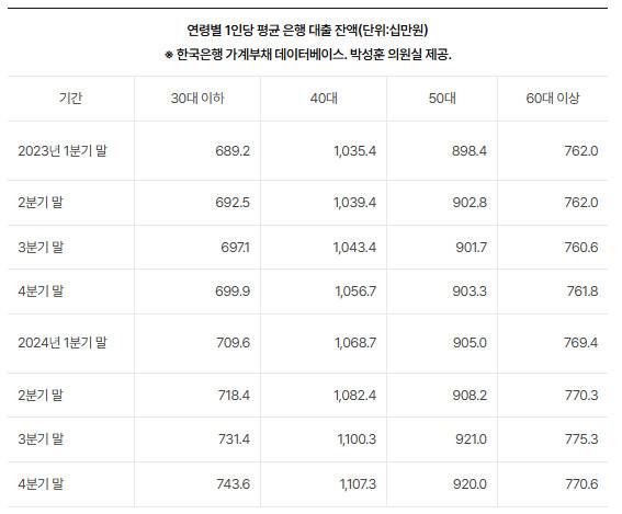 연령대별로 나눠 보면, 지난해 4분기 말 기준 40대의 1인당 평균 은행 대출 잔액은 1억1천73만원으로 역대 최고치를 기록했다.