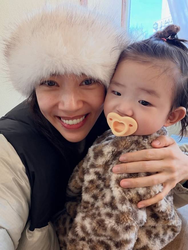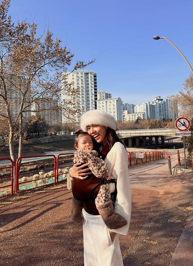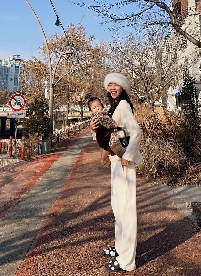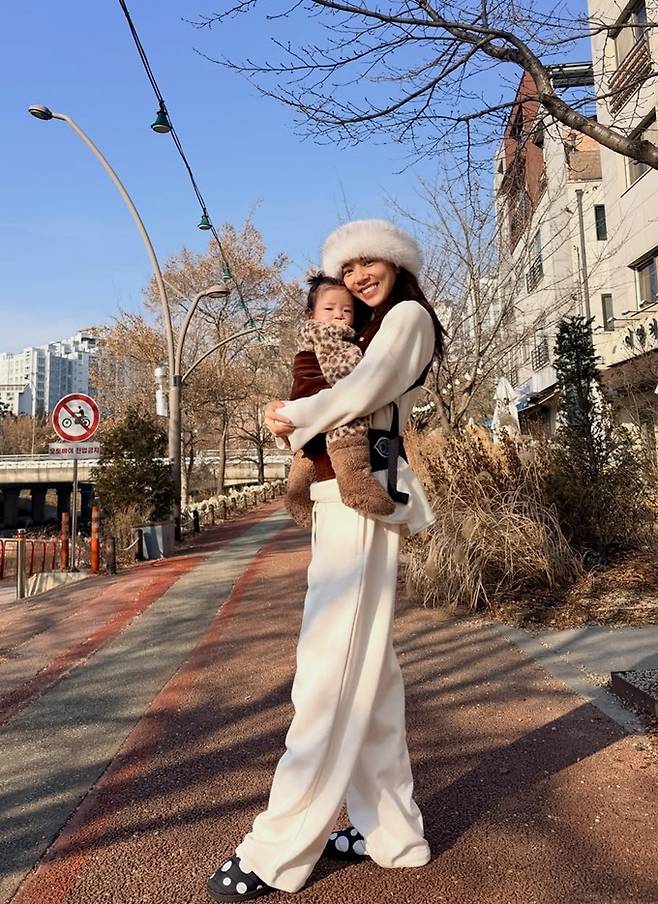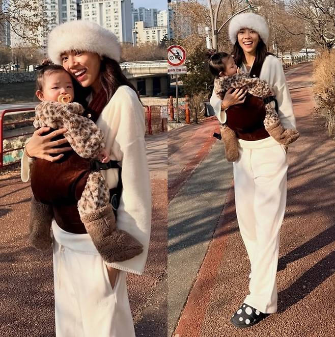 또한 9개월된 딸 해이는 표범 무늬 우주복에 털 신발을 착용한 스타일로 엄마 커플 산책룩을 완성했다.