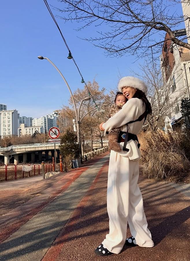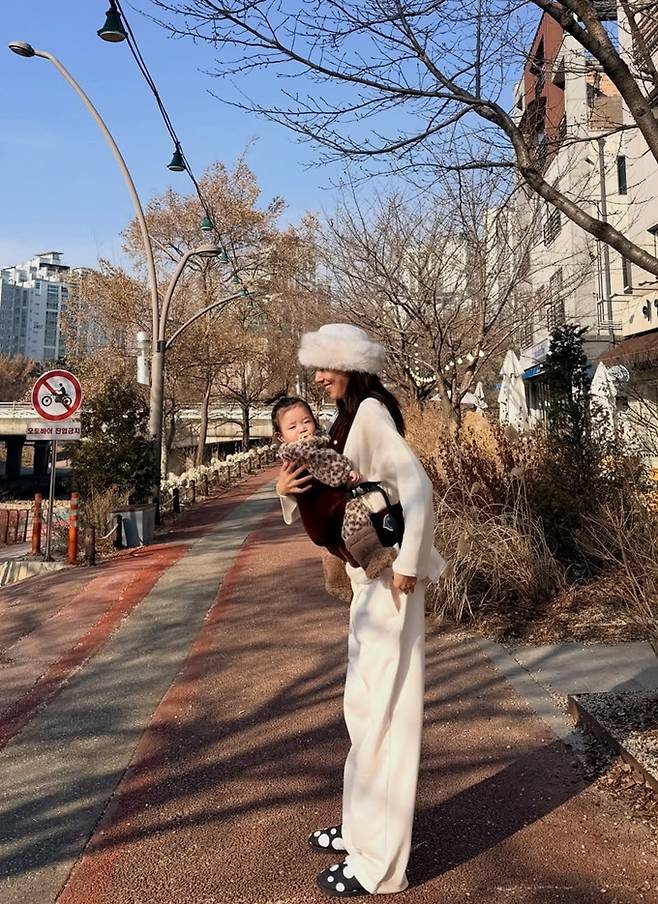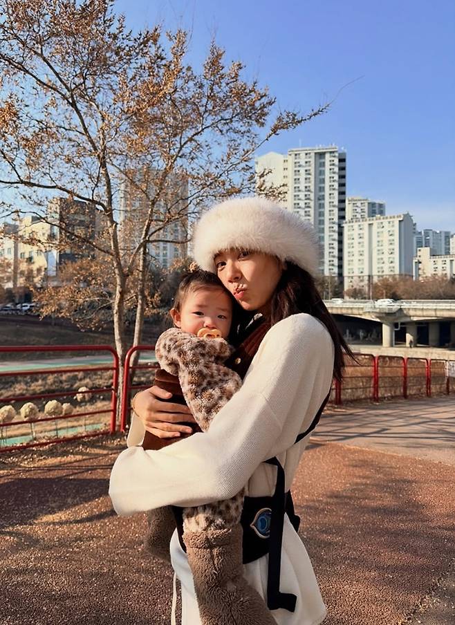 가수 겸 배우 손담비가 포근한 샤프카햇 산책룩으로 9개월 딸과 행복한 시간을 만끽했다.