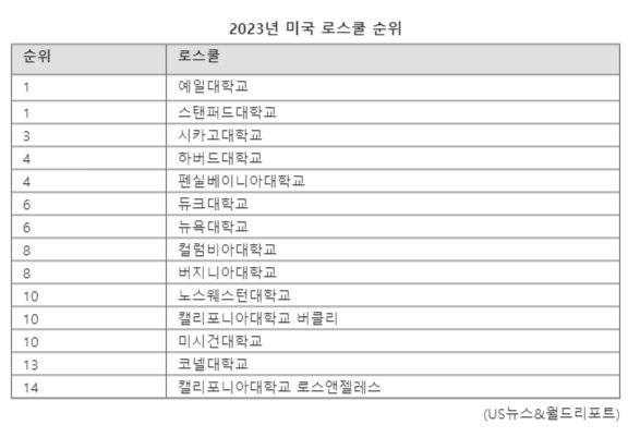 미 언론사 US뉴스&월드리포트(이하 US뉴스)는 11일(현지시간) 올해 로스쿨 순위 예비 자료를 공개하고 전체 192개 로스쿨 가운데 상위 14개 대학교의 순위를 먼저 발표했다. 전체 순위 자료는 다음주에 나올 예정이다. 예일대와 스탠퍼드대학교가 공동 1위를 차지했으며 3위는 시카고대학교였다. 펜실베이니아대학교와 하버드대학교도 공동 4위에 올랐다.