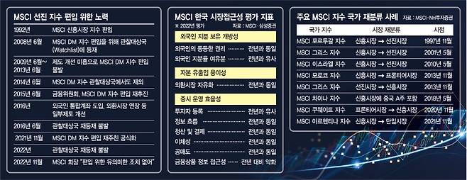 지난 1992년 MSCI 신흥 지수에 편입된 우리나라가 선진 지수에 편입되기 위한 노력은 지난 2008년 시작됐다. 2008년 6월 MSCI 선진 지수 편입을 위한 절차인 관찰대상국(Watchlist)에 등재됐다. 그러나 MSCI는 제도 개선에 미흡하다는 이유로 2009년부터 2013년까지 5년 연속 선진 지수 편입을 거절했고 결국 2014년 6월에는 관찰대상국에서도 제외했다.