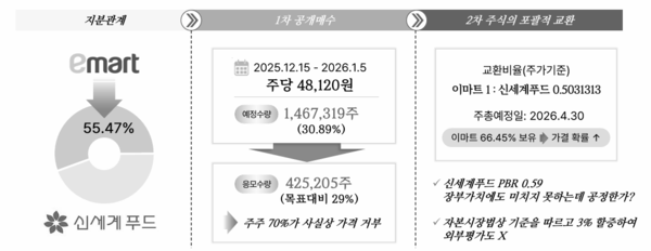 특히 이번 신고서에는 그간 공개되지 않았던 할증률 협상 과정도 일부 드러났다. 신세계푸드 측은 소수주주 보호를 명분으로 법적 상한선인 10% 할증을 요구했으나 이마트는 '자사 자문사가 산정한 교환비율 상단 준수'와 밸류업 공시를 통해 약속한 ‘연간 자사주 28만 주 소각' 물량 유지 등을 거부 핵심 사유로 내걸었다. 주주에게 지급할 자사주 물량이 늘어날 경우, 이마트 주주에게 약속한 소각 물량이 줄어들거나 이를 보완하기 위한 추가 재원 부담이 발생할 수 있다는 점을 고려한 결정으로 보인다.