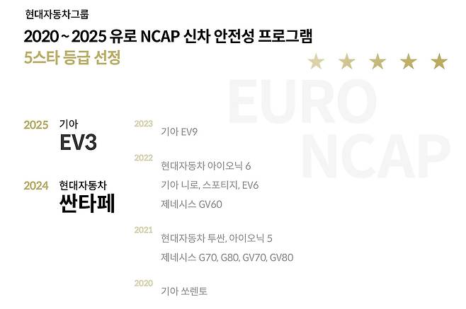 현대차그룹의 IIHS 성과는 단기간에 이뤄진 것이 아니다. 지난 2020년 평가에서도 넥쏘와 제네시스 G70, G80 등 3개 차종이 TSP+를 획득하고 총 17개 차종으로 글로벌 완성차 업체 중 최다 선정을 기록한 바 있다. 5년이 지난 현재, 뒷좌석 안전과 야간 보행자 보호 등 기준이 한층 까다로워진 상황에서도 수상 모델을 18개에서 21개로 늘리며 글로벌 안전 표준을 사실상 주도하고 있다.
