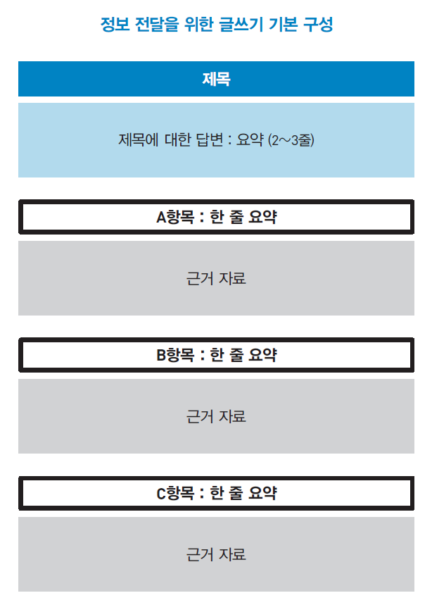 중요한 점은 (1) 첫 줄만 읽어도 상대방이 궁금해하는 내용을 알 수 있도록, 그리고 (2) 별도의 설명이 없어도 이해할 수 있도록 작성해야 한다는 점입니다. 작성자가 말로 설명해야 비로소 이해할 수 있는 보고서는 너무 복잡하거나 잘못 썼다는 의미예요.