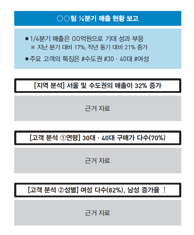 ‘1/4분기 매출 현황’ 보고서가 100페이지가 된다고 해도 결국 궁금해하는 내용은 몇 줄이면 충분합니다. ‘지난 분기 대비, 작년 동기 대비 □□ 상승(하락). 세부적으로 A 영역 ○○, B 영역은 △△, C 영역은 ○○ 상승(하락)’이 정도면 보고서를 요청한 궁금증은 일차적으로 해결됩니다.