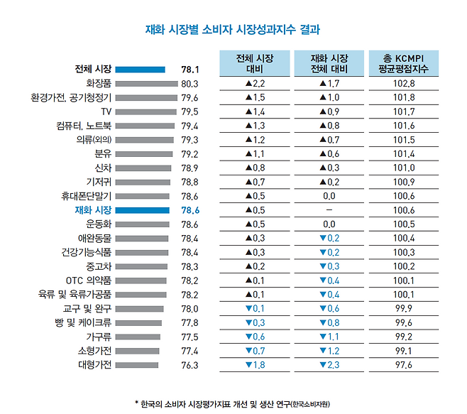 다음은 [재화 시장별 소비자 시장성과지수 결과]를 설명한 표입니다.