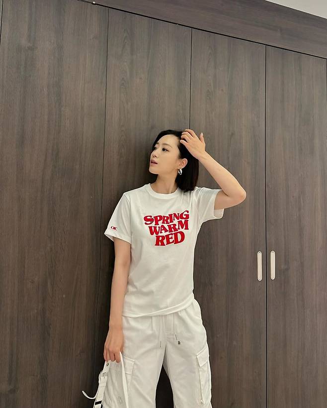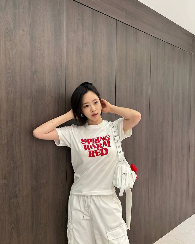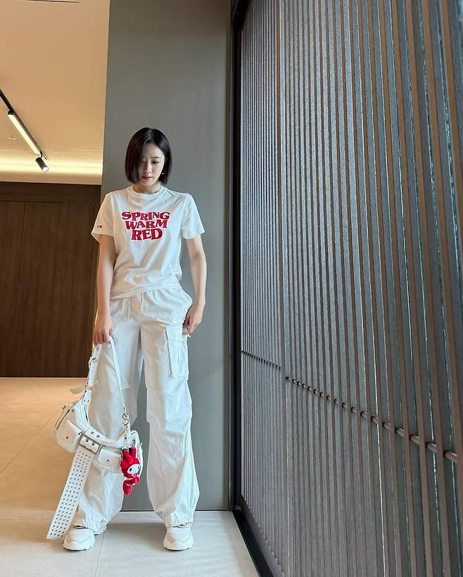 함은정은 화이트 톤의 티셔츠와 팬츠 셋업으로 청량한 여름 무드를 표현했다. 상의는 ‘SPRING WARM RED’ 레터링이 돋보이는 베이직한 크루넥 반팔 티셔츠로, 산뜻한 인상을 주며 단발 헤어와도 조화를 이뤘다. 하의는 여유 있는 실루엣의 카고 스타일 화이트 팬츠로, 실용성과 스타일을 동시에 살렸다. 여기에 동일한 톤의 화이트 숄더백을 매치해 전체적인 통일감을 주며, 가방 사이드에 장식된 레드 플라워로 포인트를 더했다.