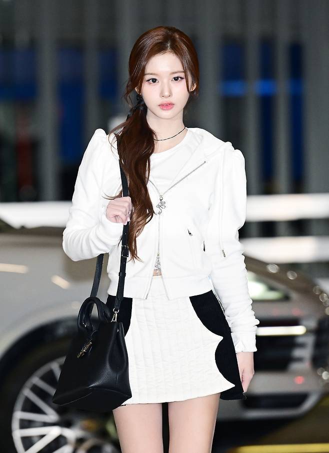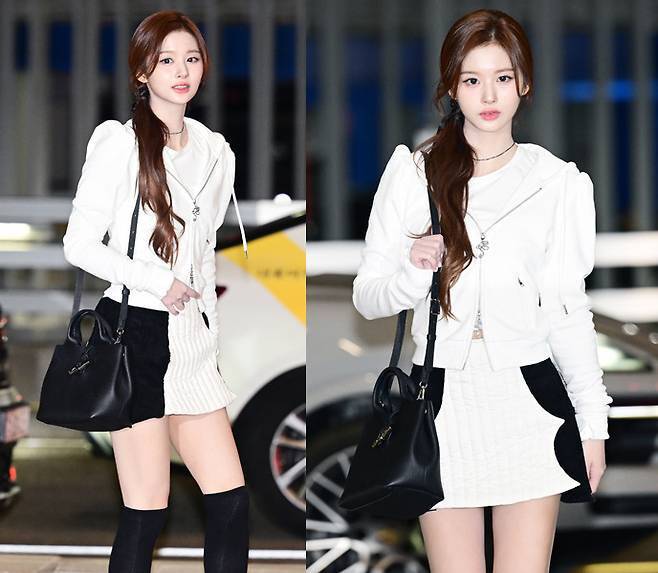 설윤은 화이트 후드와 검정 배색 디테일이 돋보이는 미니스커트 셋업에 깔끔하고 고급스러운 블랙 컬러의 핸들백을 매치해 사랑스러운 겨울 패션을 선보였습니다.