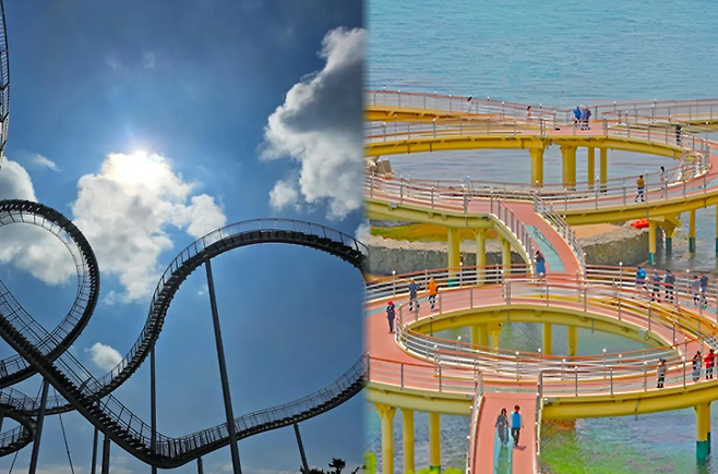 포항 북구 여남 해안로 끝자락에 서면, 바다 위로 길게 뻗어 나간 곡선의 다리가 눈길을 사로잡습니다. 마치 롤러코스터 레일처럼 부드럽게 이어지는 이 다리의 이름은 바로 포항 해상스카이워크. 총 길이 463m, 국내 최장 규모를 자랑하는 이곳은 바다와 가장 가까운 곳에서 동해를 체험할 수 있는 특별한 산책길입니다.