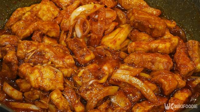구워둔 삼겹살에 양파와 양념장을 넣고 중불에서 볶는다. 양념이 고기에 고루 배면서 붉은빛이 돌고 자작한 소스가 만들어진다. 이때 불을 세게 하면 양념이 탈 수 있으니 적당히 조절해야 한다. 양념이 잘 배어들면 마지막으로 토치를 사용해 겉면을 살짝 그을려준다. 불맛이 더해지면 마치 전문점에서 먹는 듯한 깊은 풍미가 완성된다.