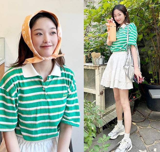 배우 이유미가 초록 스트라이프에 두건 스카프를 두른 10대 소녀 같은 걸리시룩으로 시선을 사로잡았다.