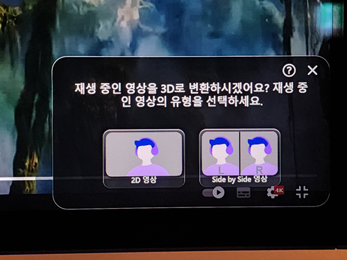 Reality Hub를 실행한 상태에서 유튜브 같은 영상 앱을 전체화면으로 띄우면, 화면 우측 하단에 영상 모드를 선택할 수 있는 메뉴가 등장한다. 여기서 영상 종류에 따라 ‘2D 영상’ 혹은 ‘Side-by-Side 영상’을 고르면 자동으로 3D 변환이 시작된다.