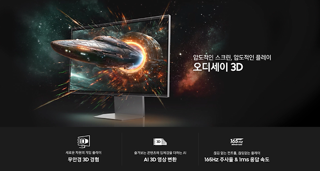 ‘오디세이 3D’는 패널 전면에 렌티큘러 렌즈를 적용했으며, ‘AI 3D 영상 변환’ 기능을 통해 일반적인 2D 게임 및 영상을 입체인 3D 콘텐츠로 전환해주는 독특한 모니터이다.