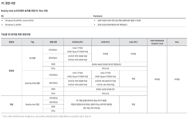 다만, 3D 변환 기능은 Reality Hub라는 전용 소프트웨어를 통해 실행된다. 즉, 처음부터 모든 게임이나 영상이 자동으로 입체로 바뀌는 건 아니기에, Reality Hub를 설치해야 한다. 이 소프트웨어는 삼성전자 공식 홈페이지나 마이크로소프트 스토어를 통해 다운로드 가능하다.