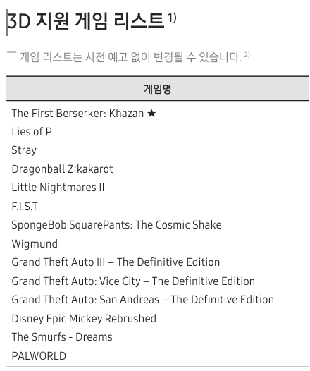 오디세이 3D가 출시된지 얼마되지 않아 아직까지 지원되는 게임은 많지 않다. 다만, 삼성 측에서 더욱 실감나는 3D 게이밍 환경을 조성하기 위해 게임 개발사들과 지속적인 협업을 추진 중이라고 밝힌 만큼, 시간이 지나면 지원되는 게임은 점점 늘어날 것으로 보인다.