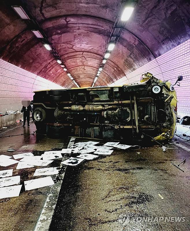 (용인=연합뉴스) 13일 오전 경기 용인시 영동고속도로 강릉 방향 마성터널 내에서 초등학생들을 태운 소형 버스가 터널 벽을 친 뒤 넘어져 10대 남학생 2명이 중상을, 4명이 경상을 입었다.